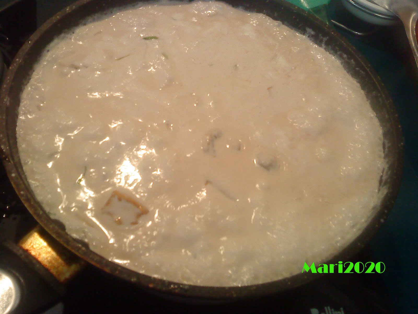 Заливаем все сливками. Даем сливкам закипеть и немного увариться. Добавляем вино