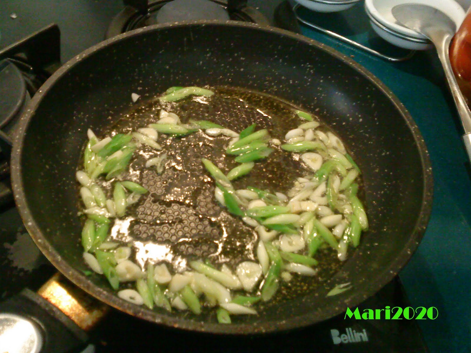 5.Готовим соус. Нарезаем зеленый лук под углом. Белую часть складываем